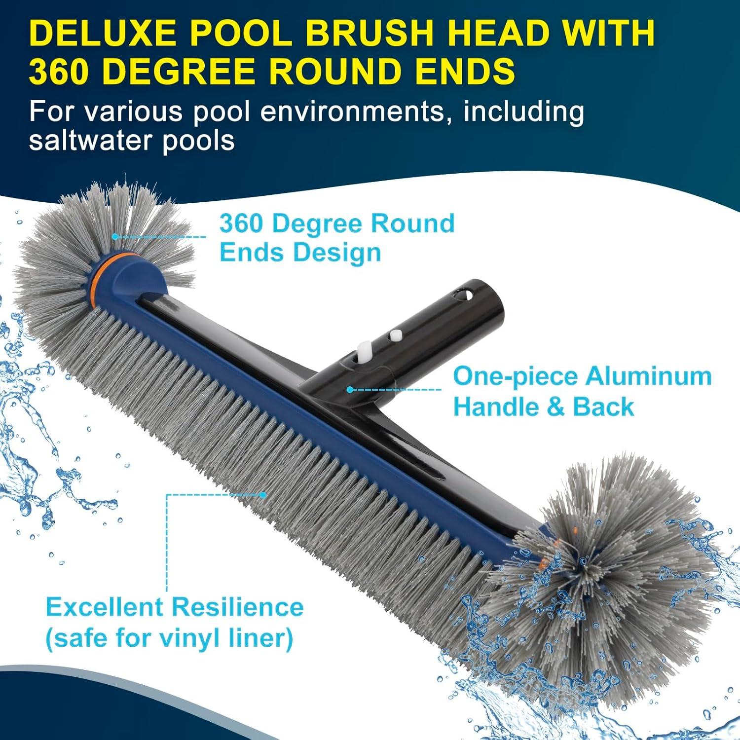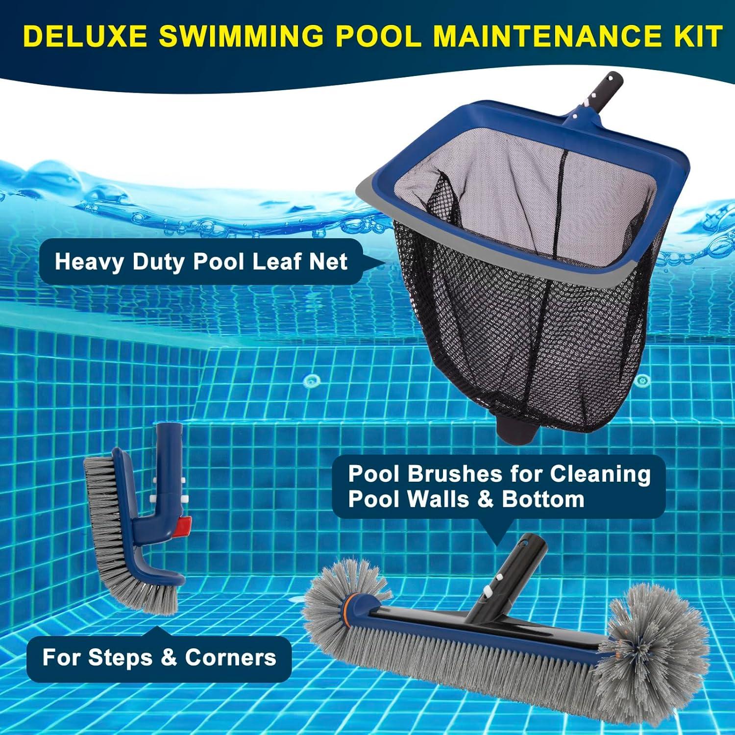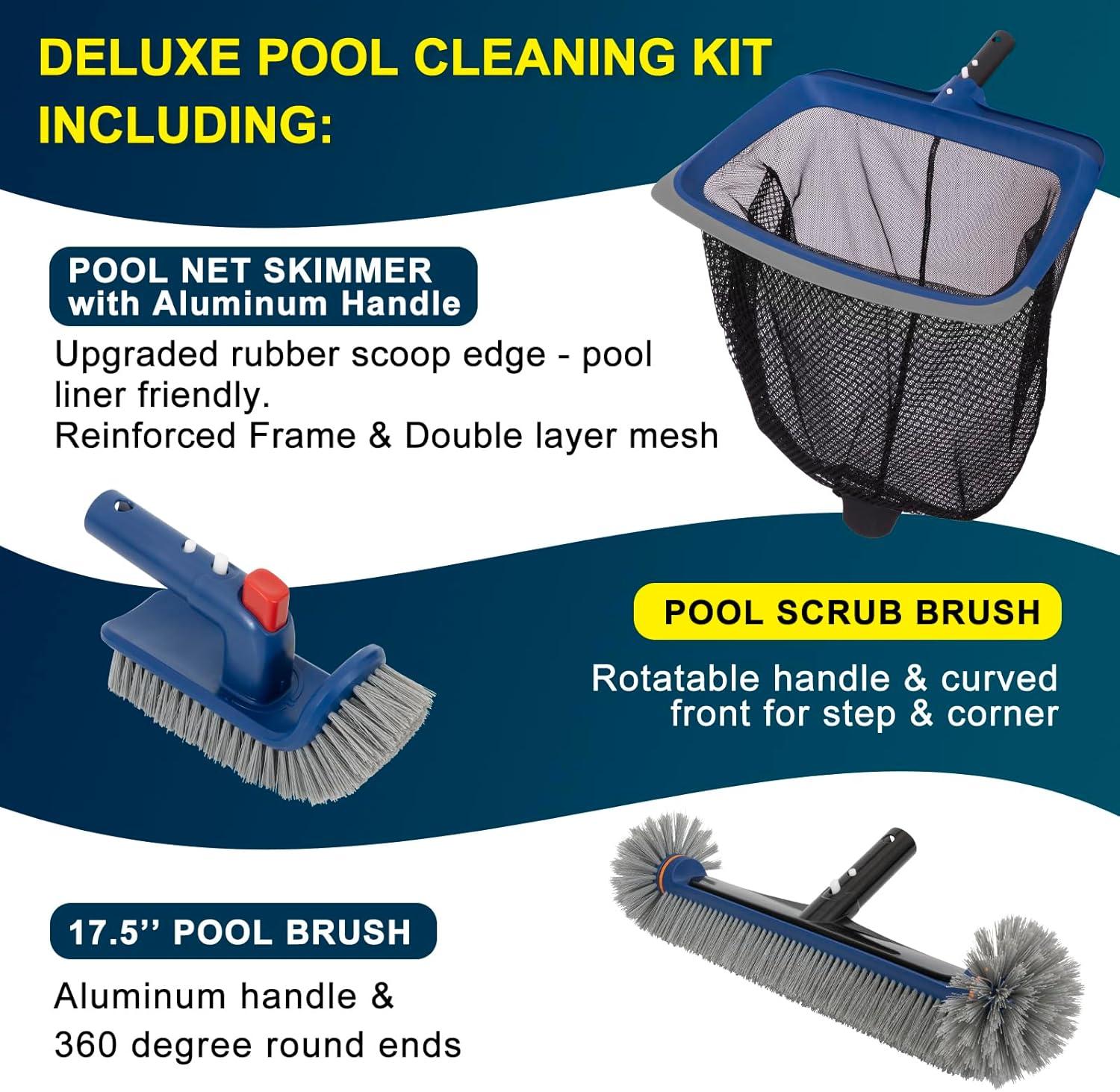 DELUXE POOL CLEANING KIT PROVIDES COMPLETE CLEANING SOLUTION: Our Deluxe Swimming Pool Cleaning Kit features a pool skimmer net with a rubber scoop edge for efficient debris removal; a 17.5’’ pool brushes for cleaning pool walls, floors, and a rotatable pool brush head for cleaning corners & steps