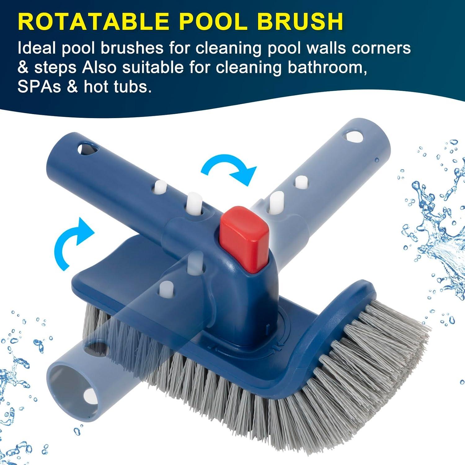 VERSATILE POOL BRUSHES FOR CLEANING POOL WALLS, FLOORS STEPS & CORNERS: With a 17.5″ pool brush head equipped with 360 degree round ends and a rotatable handheld pool scrub brush, this pool cleaning kit ensures thorough cleaning of pool walls floors steps & corners