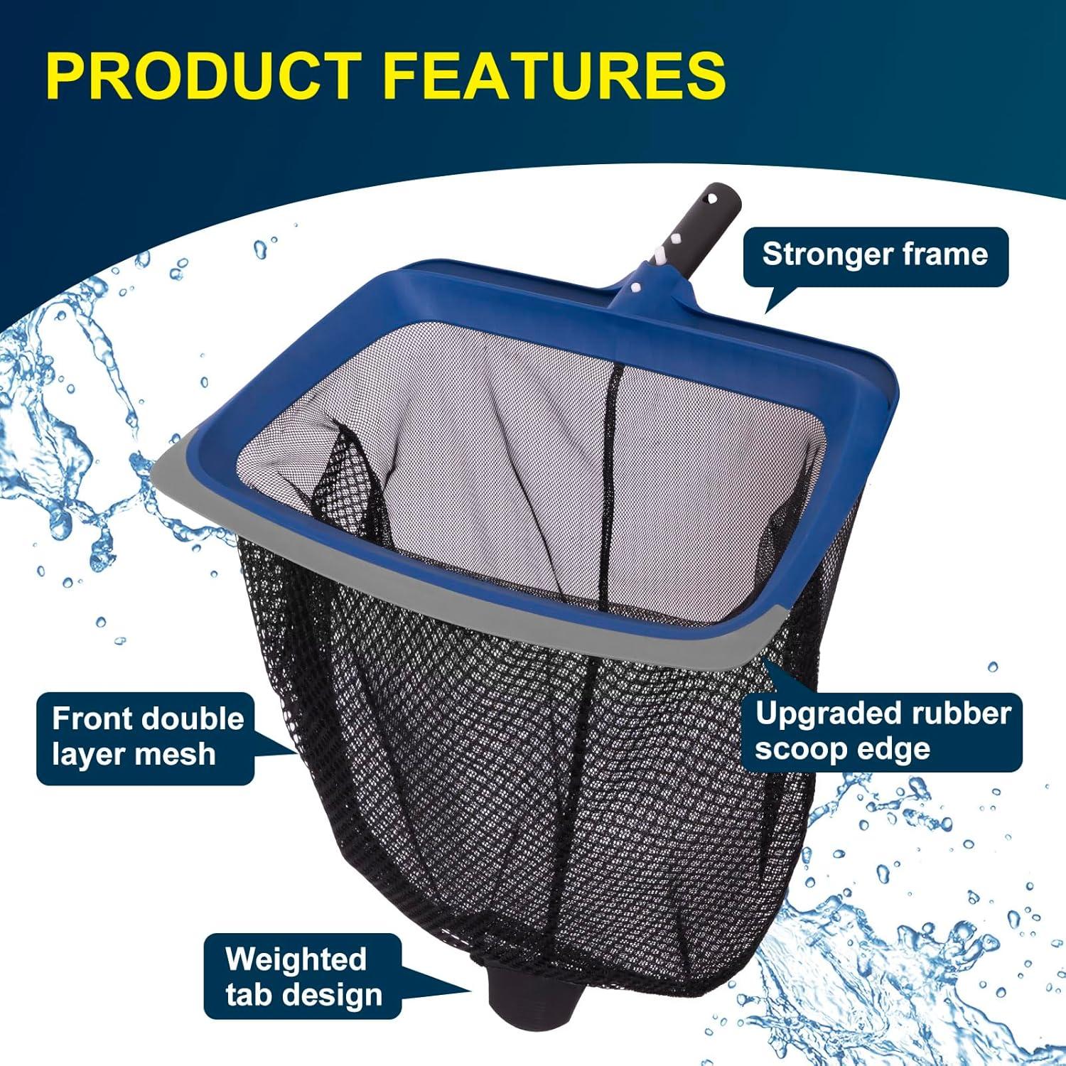 DURABLE & EFFICIENT POOL SKIMMER NET: Engineered with an aluminum handle, reinforced frame, and double-layer netting bag, our pool skimmer net is built to last. The rubber scoop edge and larger capacity netting bag ensure efficient debris removal