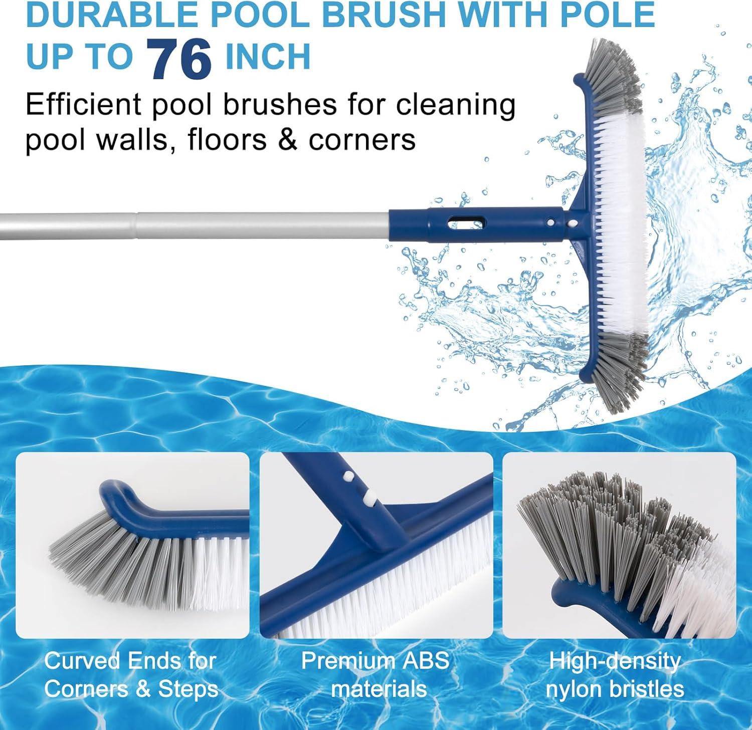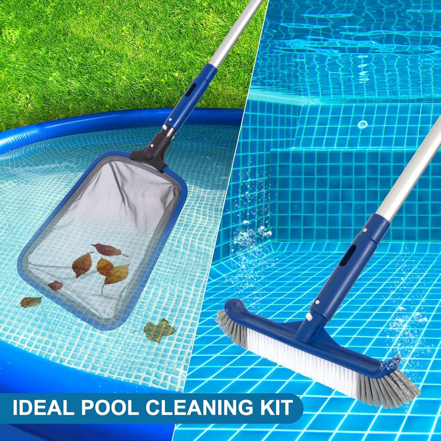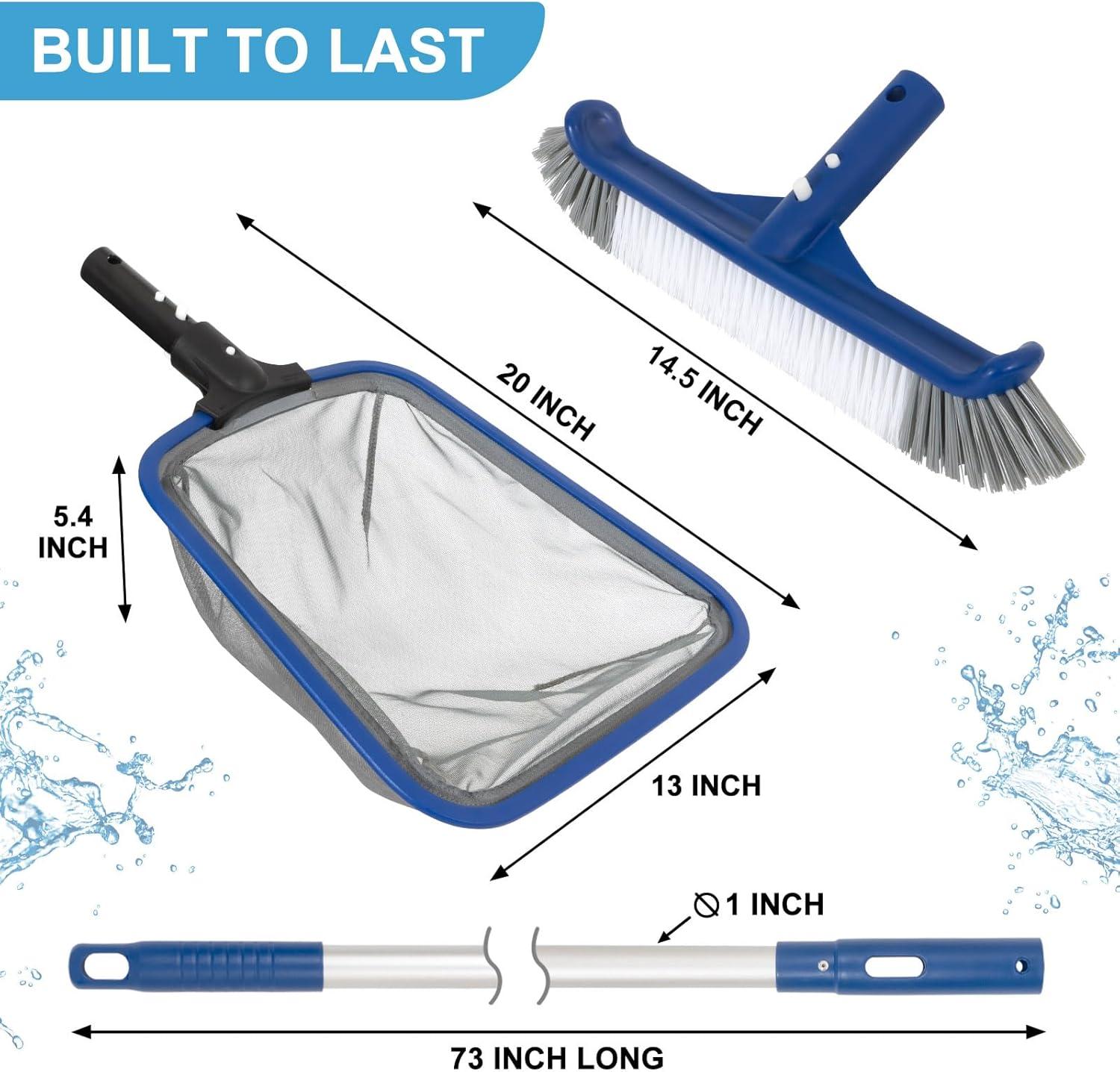 3-IN-1 DELUXE POOL CLEANING KIT – COST-EFFECTIVE SOLUTION:The deluxe pool cleaning kit includes 1 ultra-fine mesh pool skimmer net, 1 sturdy pool brush, and 1 x 73'' Aluminum Pool Pole. Ideal for pools, spas, hot tubs, and ponds