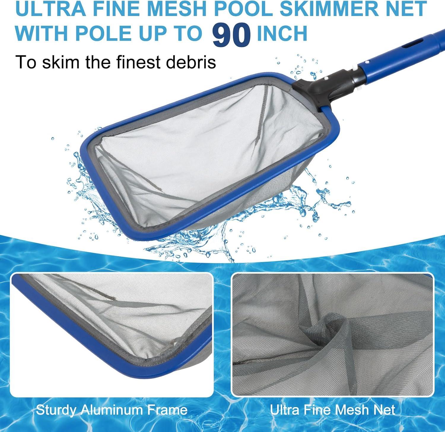 Ultra Fine Mesh Pool Skimmer Net with pole reaching up to 90 inches; Reliable Pool Brush with Pole, reaching up to 76 INCHES