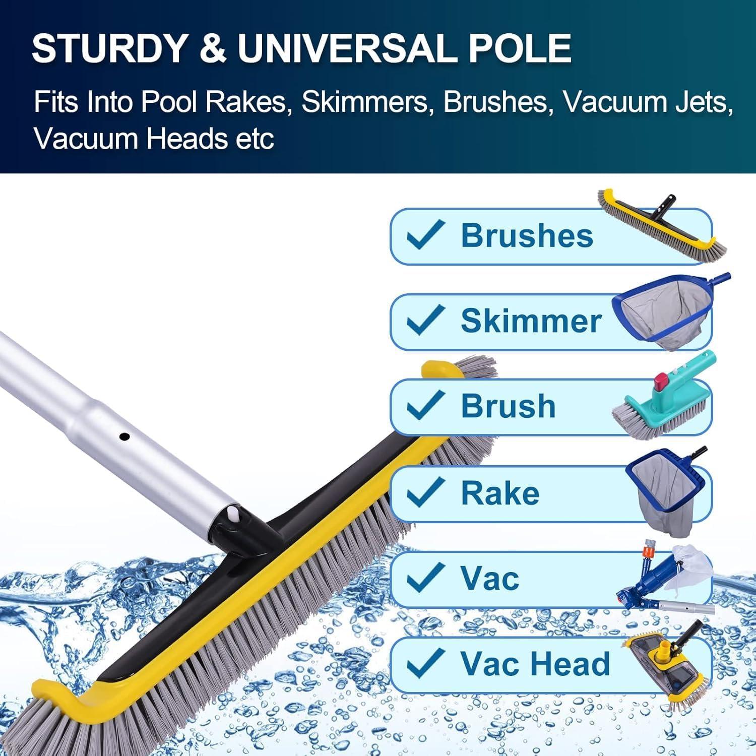 SUITABLE FOR STANDARD POOL ACCESSORIES: the multi-functional aluminum pool pole to go along with many of your pool cleaning equipment, such as pool skimmer net, pool brushes pool vacuum heads etc