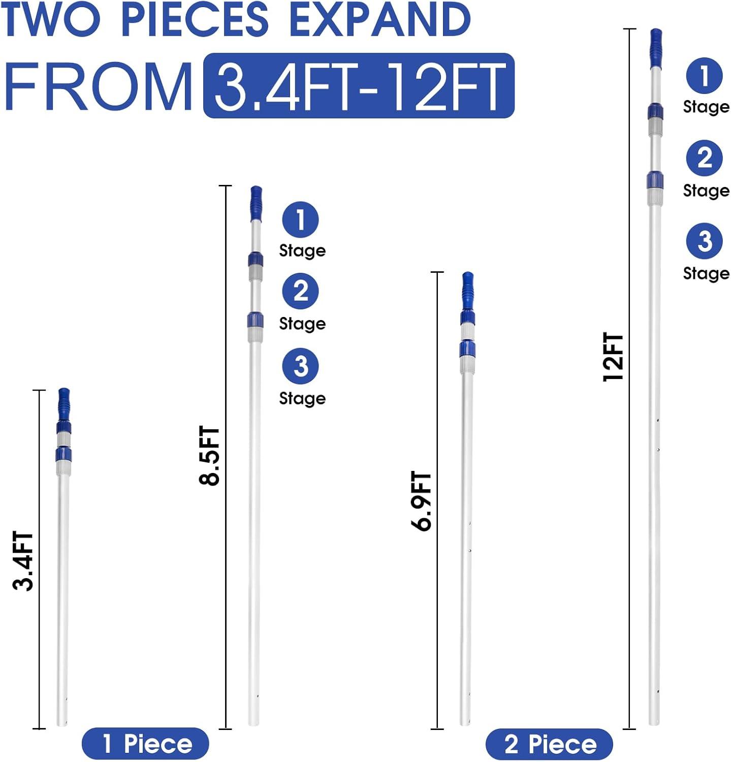 Poolvio 12FT Telescopic Pole, Pool Round Brush & Self-Repair Pool Rake