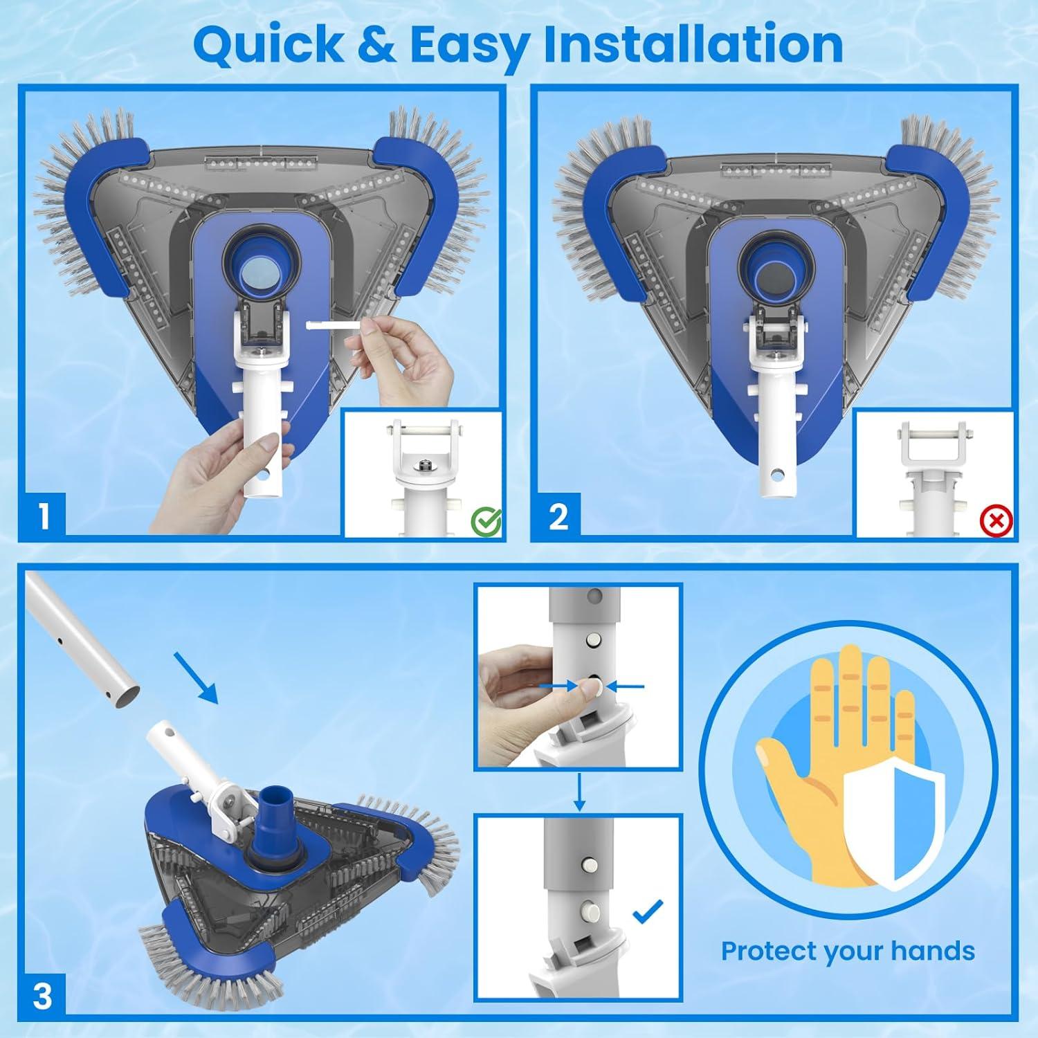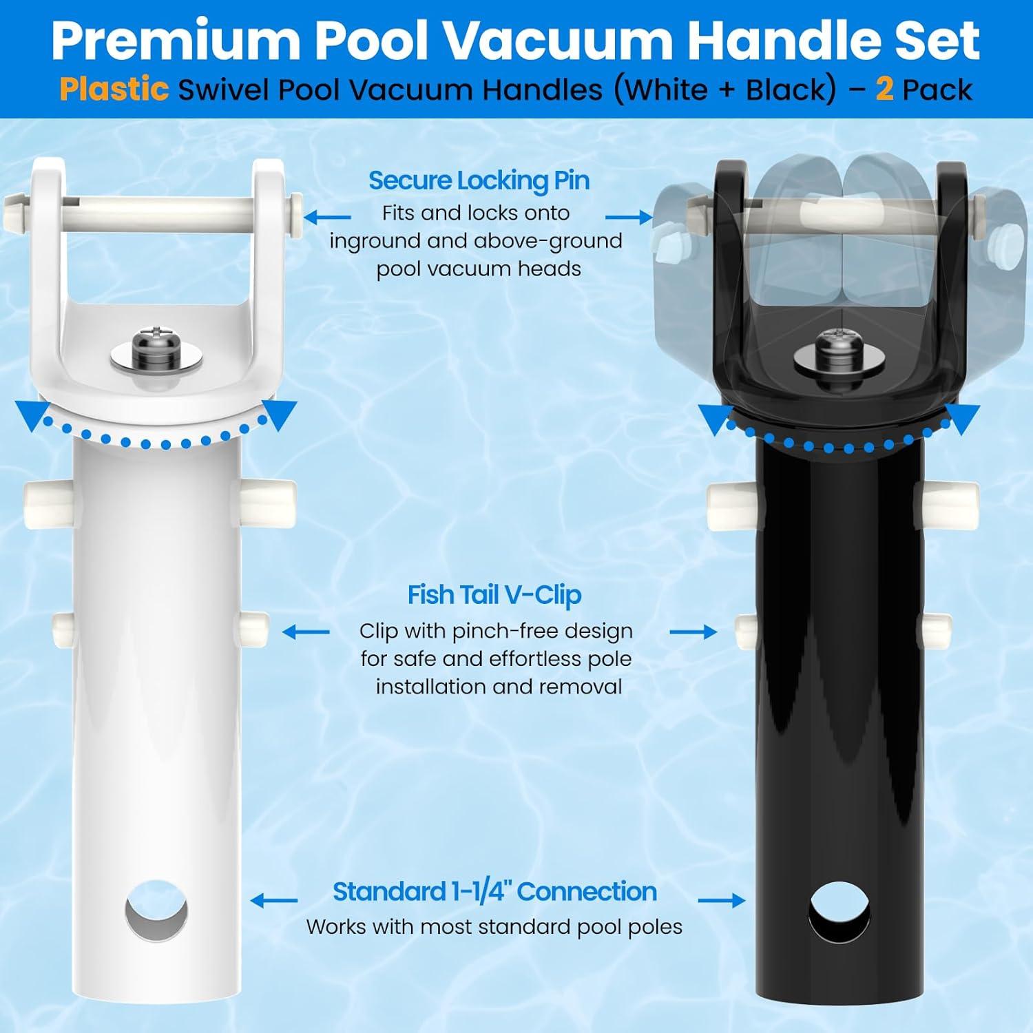 Upgrade your pool cleaning experience with the Poolvio Pool Vacuum Head Replacement Handles (2-Pack). These heavy-duty plastic swivel handles come with EZ clips and secure locking pins, providing a reliable solution for replacing worn-out or broken vacuum head handles. The set includes two premium handles (white & black), designed for durability and long-lasting performance. Our handles are compatible with most standard 1-1/4″ telescopic poles, featuring EZ clips that allow quick, safe, and pinch-free installation, so you can attach them effortlessly with one hand. The smooth swivel design provides flexible control, reducing cleaning effort by up to 50% and making it easier to maneuver around corners and pool edges. These handles attach firmly to inground and above-ground pool vacuum heads, ensuring stable and reliable operation during your pool maintenance tasks. Whether you have an above-ground or in-ground pool, these replacement handles make your cleaning routine simpler, safer, and more efficient. At Poolvio, we prioritize your satisfaction. We always provide the best solutions for your pool needs, and our team is ready to assist with any questions or concerns within 24 hours. Enjoy a hassle-free pool cleaning experience with confidence and reliability.
