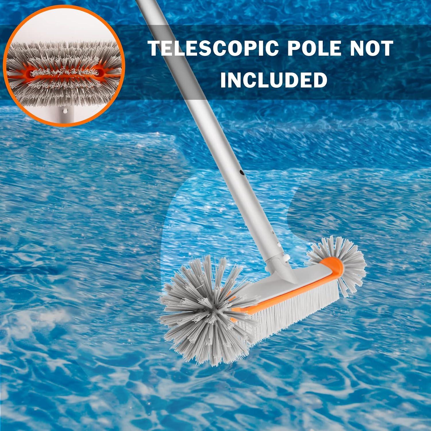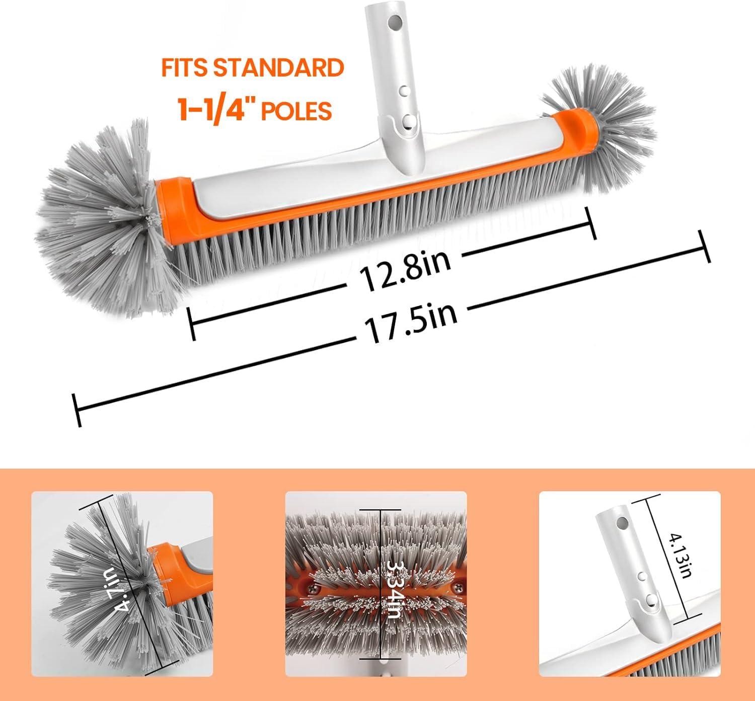 Poolvio Professional 17.5″ Floor & Wall Pool Cleaning Brush with Tough Around Nylon Bristles, EZ Clip Aluminum Handle- Easily Sweep from Walls, Floors, Steps (Orange)(Orange)